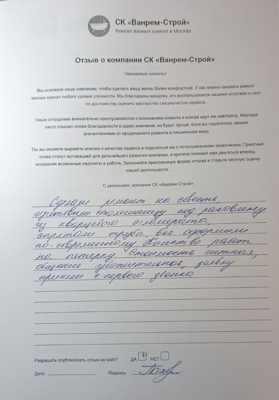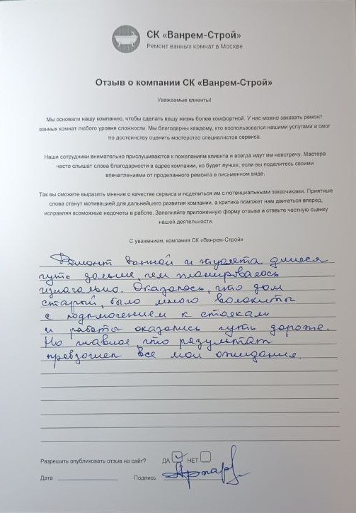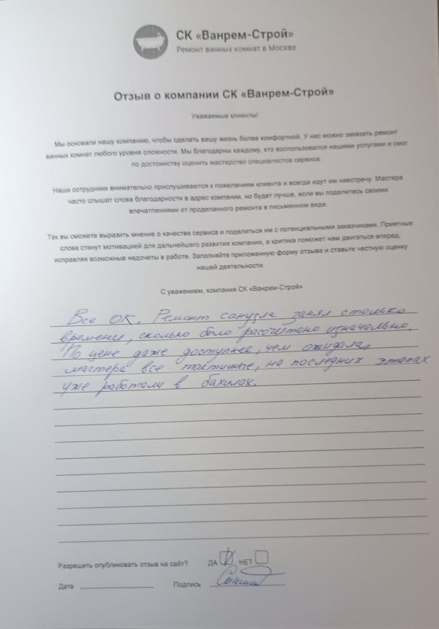 Реальные заказчики дают объективную оценку комплексной работы коллектива сотрудников СК «Ванрем-Строй». Для получения достоверной информации о качестве предоставляемых нами услуг по ремонту ванных комнат, санузлов и туалетов, изучите отзывы клиентов нашей компании.