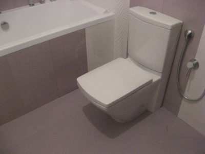 При ремонте раздельного санузла на улице Вавилова мастера полностью демонтировали отделку вплоть до бетона и разобрали старый трубопровод. После укладки стяжки, выравнивания поверхностей и монтажа коммуникаций мы установили на потолок подвесную конструкцию со встроенными светильниками, а пол и стены облицевали крупноформатной керамической плиткой в трендовом бежевом цвете. Прямоугольная ванна занимает всю нишу вдоль глухой стены. Изюминки интерьера: облицованный в тон общей композиции экран, отсутствие привычного умывальника и монтаж крана прямо на торцевой части ванны. В помещении также установлены подвесной унитаз с душем биде и электрический полотенцесушитель. Цена ремонт – 124 тыс. руб. Черновые материалы – 33000 р.