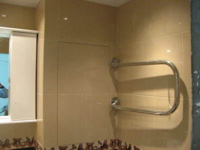 Наша компания выполнила ремонт санузла на Рязанском проспекте. Изюминкой интерьера стало оформление дизайна неординарным орнаментом. Декоративные плитки и фреза с изображением золотых бабочек перемежаются с однотонным кафелем бежевого и темно-коричневого цветов. За счет контраста удалось визуально расширить пространство.