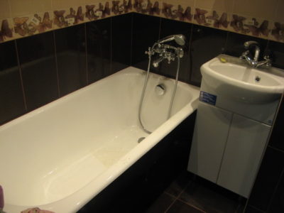 Мы установили унитаз, акриловую ванну с гибким душем, рукомойник со шкафом и зеркалом, а также смонтировали держатели для туалетной бумаги и полотенец. Проведена новая электропроводка и выполнен монтаж электрического полотенцесушителя. Подвесной потолок оформлен пластиковыми панелями со встроенными светильниками. Смета ремонта — 108000 р. Черновые материалы — 36 тыс. руб.