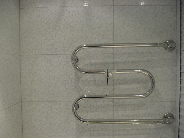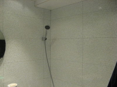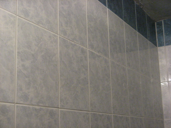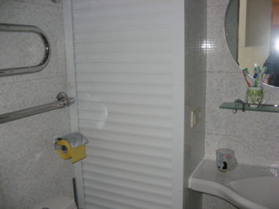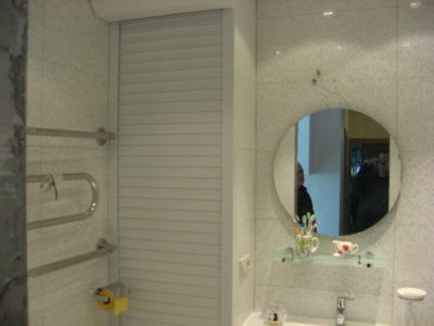 Наша компания выполнила ремонт 2 совмещенных санузлов на улице Салтыковская. Стены облицованы керамической плиткой нежно-голубого оттенка и цвета морской волны. Между контрастной отделкой выложена фреза с цветочным рисунком. На пол уложен кафель в тон общему интерьеру. В комнате установлены ванна с гибким душем, умывальник модели «Тюльпан», унитаз и полотенцесушитель. Инженерные коммуникации скрыты за вертикальными жалюзи, а полость под ванной — экраном с раздвижными дверками. Потолок оформлен пластиковыми панелями. Бюджет ремонта на один санузел составил 117 тысяч рублей. Черновые материалы — 30 тыс. руб.