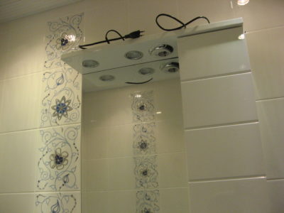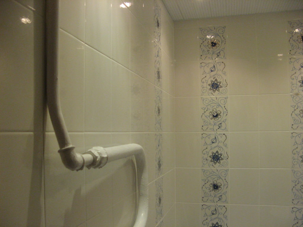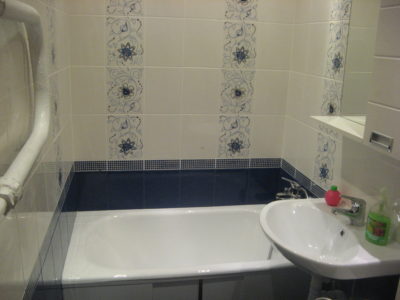 Капитальный ремонт совмещенной ванной и туалета на улице 2 Рощинская занял 22 дня. Мастера полностью демонтировали коммуникации, сняли старую отделку со стен и напольное покрытие. На пол была уложена новая стяжка и синяя плитка, стены облицованы кафелем белого и темно-синего цвета, а потолок декорирован подвесной реечной конструкцией. Для придания комнате нарядного вида над ванной выложен вертикальный узор с цветочным принтом и золотым тиснением. С правой стороны от входа установлены унитаз и подвесной умывальник, над которым мы смонтировали зеркало с боковым шкафом и дополнительными светильниками. Цена ремонта – 98000 рублей. На черновые материалы ушло 31 тыс. руб.