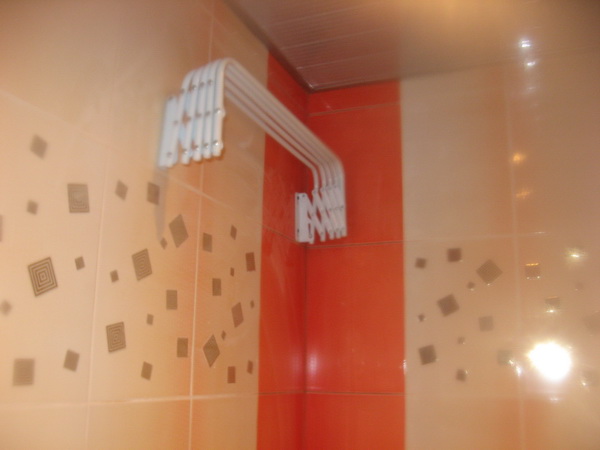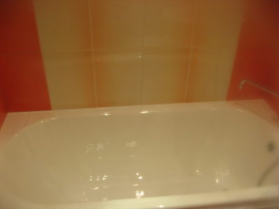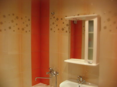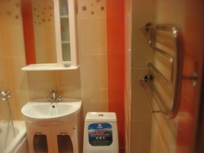 При выполнении ремонта санузла на Варшавском шоссе были использованы яркие отделочные материалы сочного оранжевого и нежного кремового цветов. Эксклюзивности интерьеру придает декоративный орнамент по верхней верхней части стены. Потолок оформлен пластиковыми панелями с вмонтированными точечными светильниками. Нетрадиционным решением стала установка складного полотенцесушителя. Акриловая ванна зашита экраном с дверцами, смонтирован умывальник с тумбой, укомплектованной стеклянными фасадами, а также установлен унитаз стандартной модели. Стоимость ремонта — 124000 руб. Цена черновых материалов — 30890 р.