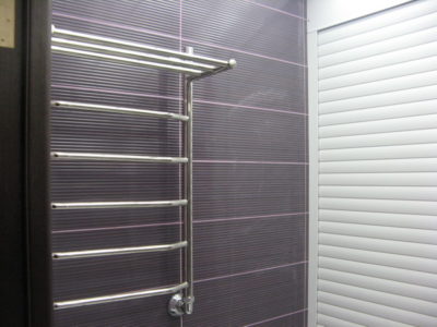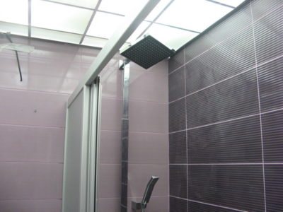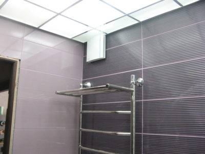 В санузле установлены ванна с защитными стеклянными шторками и гибким душем, унитаз, полотенцесушитель и стиральная машина. Потолок оформлен металлическим профилем с прозрачными панелями. Смета по ремонту составила 121 тысячу рублей. Стоимость черновых материалов — 30 тыс. 200 руб.