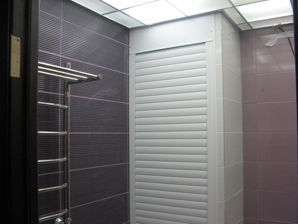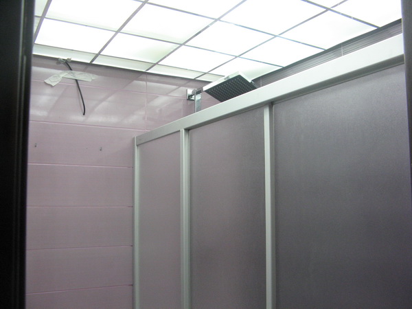 В санузле установлены ванна с защитными стеклянными шторками и гибким душем, унитаз, полотенцесушитель и стиральная машина. Потолок оформлен металлическим профилем с прозрачными панелями. Смета по ремонту составила 121 тысячу рублей. Стоимость черновых материалов — 30 тыс. 200 руб.