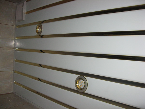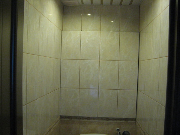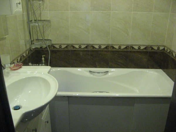 В ванной комнате удалось компактно расположить ванну с боковыми ручками и гибким душем, мойдодыр на три секции и навесные полки. Точечные светильники вмонтированы в подвесной потолок из пластиковых панелей. В туалете установлен новый унитаз, стены облицованы двухцветным кафелем, а на пол уложена керамическая плита с имитацией под мрамор.