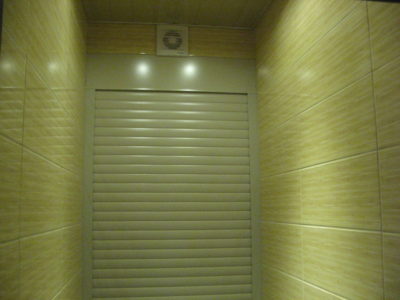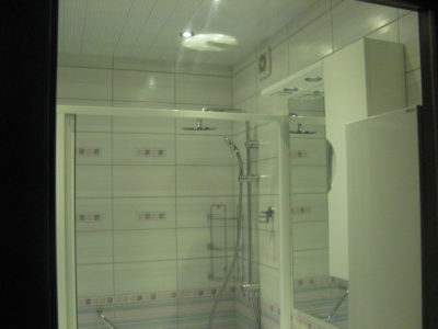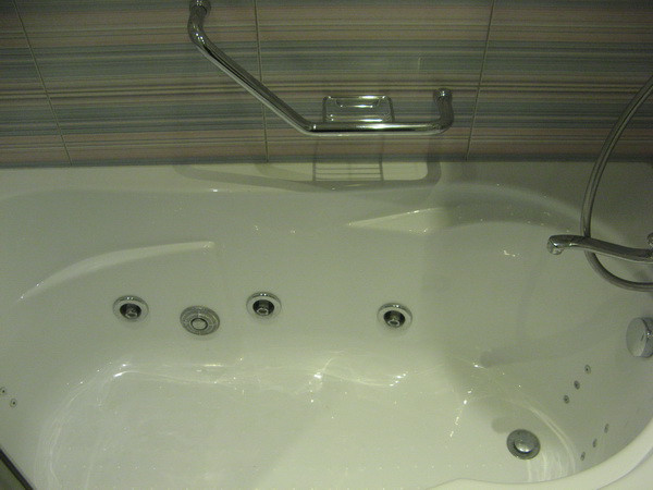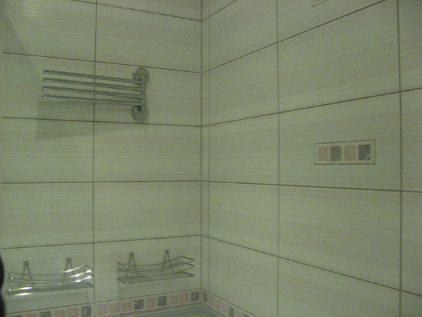Полы и стены ванной комнаты облицованы керамической плитой с горизонтальным рисунком. В помещении установлены ванна с функцией джакузи, раздвижные шторы, умывальник с тумбой, полка для полотенец, полотенцесушитель, вертикальный шкаф и стиральная машина. Стоимость черновых материалов — 32200 руб. Цена ремонта — 120 тыс. 900 руб.