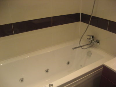 Капитальный ремонт совмещенного санузла в квартире на улице Краснобогатырская был выполнен в классическом дизайне. В ходе ремонтных мероприятий была полностью заменена дверная коробка, установлена новая дверь, заменены все инженерные коммуникации. Отделка поверхностей и сантехника выполнены в едином дизайне: в белом и бордовом цветах. В подвесной потолок встроены точечные светильники, а на стену повешено зеркало большого размера. В помещении удалось компактно разместить гидромассажную ванну, подвесной шкаф с рукомойником, унитаз и полотенцесушитель. Стоимость работ составила 123 тысяч рублей. На черновые материалы было потрачено 30700 руб.