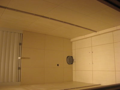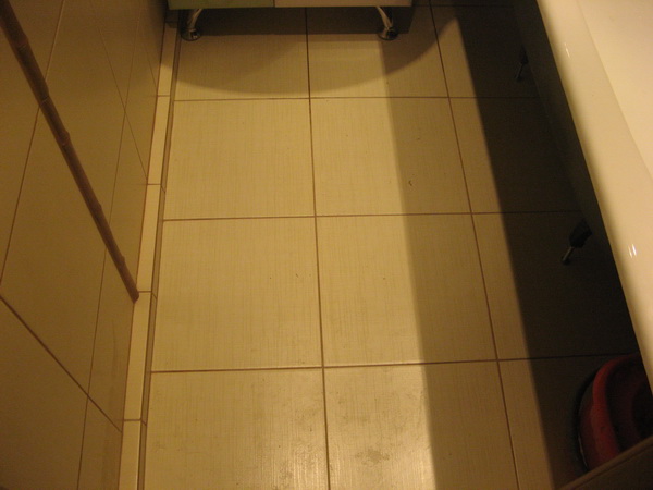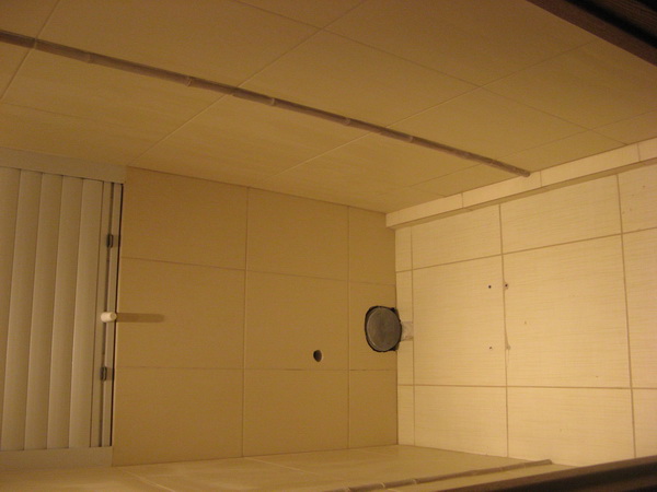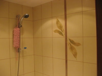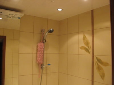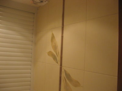 В ходе ремонта были полностью демонтированы устаревшее сантехническое оборудование и отделка с поверхностей. На стены и полы в помещениях уложена керамическая плитка оливкового цвета, а потолок выполнен из пластиковых панелей. Привнести в дизайн нотку элегантности удалось за счет укладки декоративных элементов с имитацией под бамбуковое дерево.