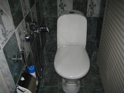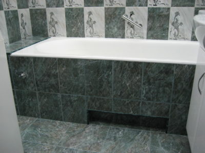 Наша компания выполнила капитальный ремонт ванной комнаты и туалета на улице Профсоюзная. Дизайн отличается самобытностью. Интерьер оформлен в роскошных темно-зеленых и серых тонах с имитацией под керамогранит. Стены облицованы плиткой, расположенной в шахматном порядке. Однотонный кафель чередуется с плитами с фактурным цветочным рисунком.