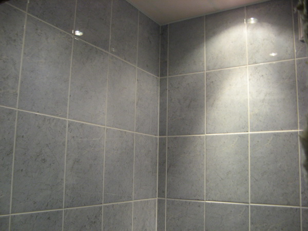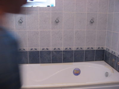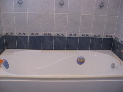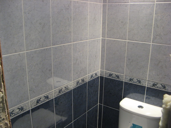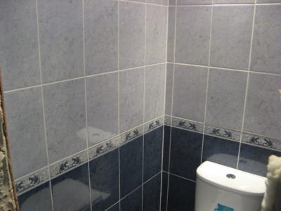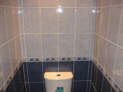 Наша компания выполнила капитальный ремонт раздельного санузла, выбрав для облицовки поверхностей в обоих помещениях плитку двух расцветок под мрамор (нежно-голубая и темно-синяя). В качестве разделителя использована декоративная фреза с цветочным орнаментом. В ванной комнате установлен полотенцесушитель, большая акриловая ванна с цельным защитным экраном и умывальник. В туалете старые трубы и унитаз заменены на современные аналоги. Для организации освещения в подвесной потолок вмонтированы точечные светильники.