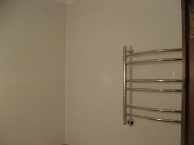 В ходе ремонта ванной комнаты по улице Авиамоторная были произведены капитальные изменения планировки помещения. Мы оформили пространство в стиле минимализма, использовав классическое сочетание светлой и бежевой плитки. С целью повышения комфорта в комнате были установлены акриловая ванна с удобными боковыми ручками, защитный экран со встроенными полками и электрический полотенцесушитель. Свободную циркуляцию воздуха обеспечивает приточная вентиляция с декоративной решеткой. Эксклюзивности интерьеру придает утонченный рисунок лилии на глухой стене. Стоимость ремонта составила 55000 рублей. Цена черновых материалов — 18000 руб.