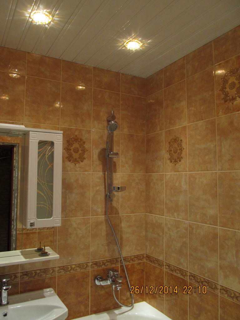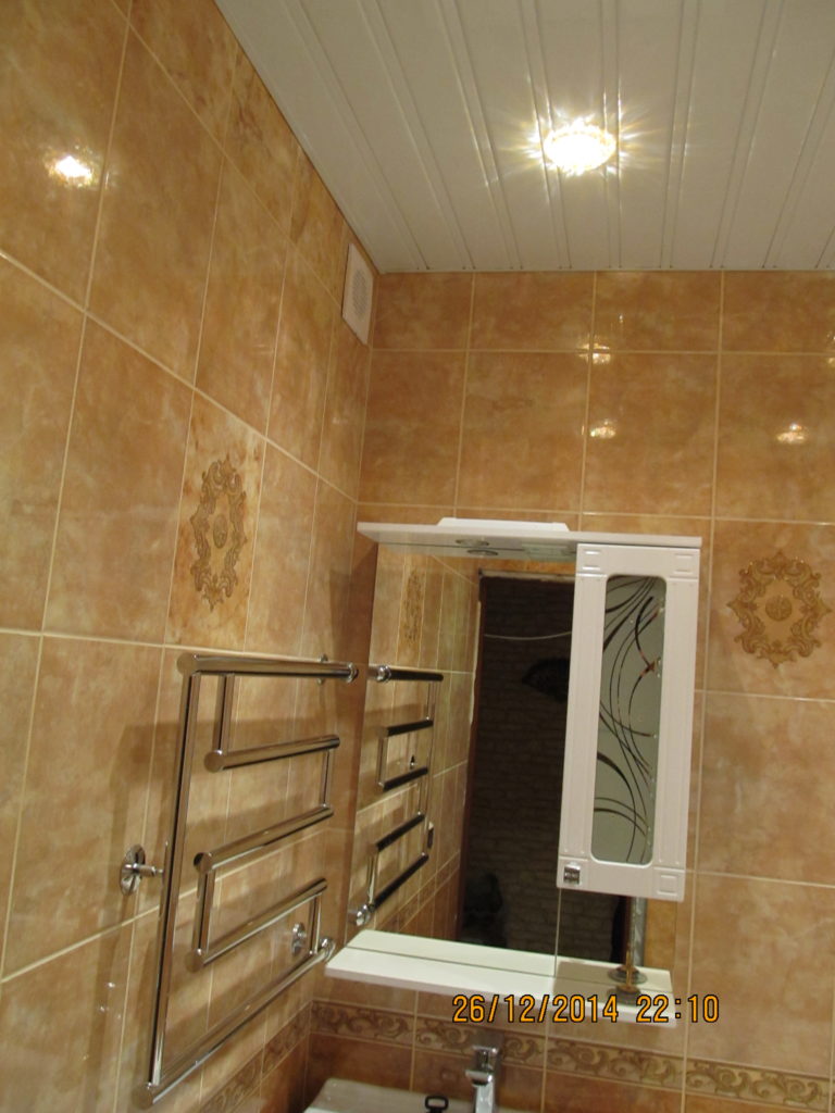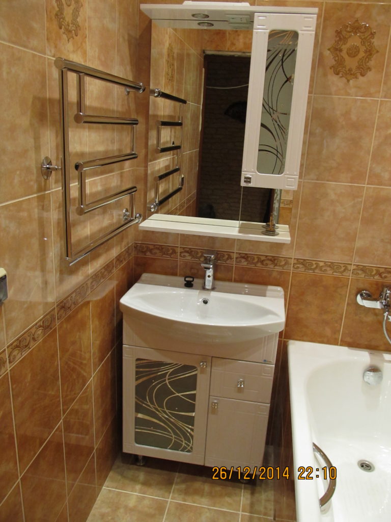 Мы выполнили капитальный ремонт ванной комнаты на Рязанском проспекте по утвержденному заказчиком дизайнерскому проекту. В малогабаритном помещении размерами 1,5х1,35 м мастера установили ванну с удобными ручками, держатель для душа, полотенцесушитель и умывальник с двухсекционной тумбой. Над раковиной мы повесили зеркало с боковым шкафчиком и вмонтировали в верхнюю полку точечный светильник. Для отделки поверхностей был выбран кафель светло-бежевого и кофейного тонов. В подвесной потолок встроено 4 светильника. Общая стоимость ремонта – 74000 руб. На черновые материалы ушло 25000 р.